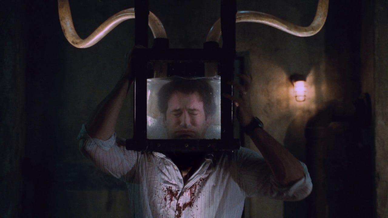 Still, these grisly movies engrossed me from afar; I’d read the Wikipedia plot summary of each new movie when it arrived, intrigued by the intricate serial storytelling and the weird, unexpected swings the movies would sometimes take, like killing their lead character at the end of the third movie and then continuing for 4 more films, all still top-billed by Tobin Bell, without breaking a sweat. I’d read about the traps or sometimes watch clips online and be grossed out and horrified, but also kind of transfixed. What was the appeal here, I’d wonder, and why do I want to see more?