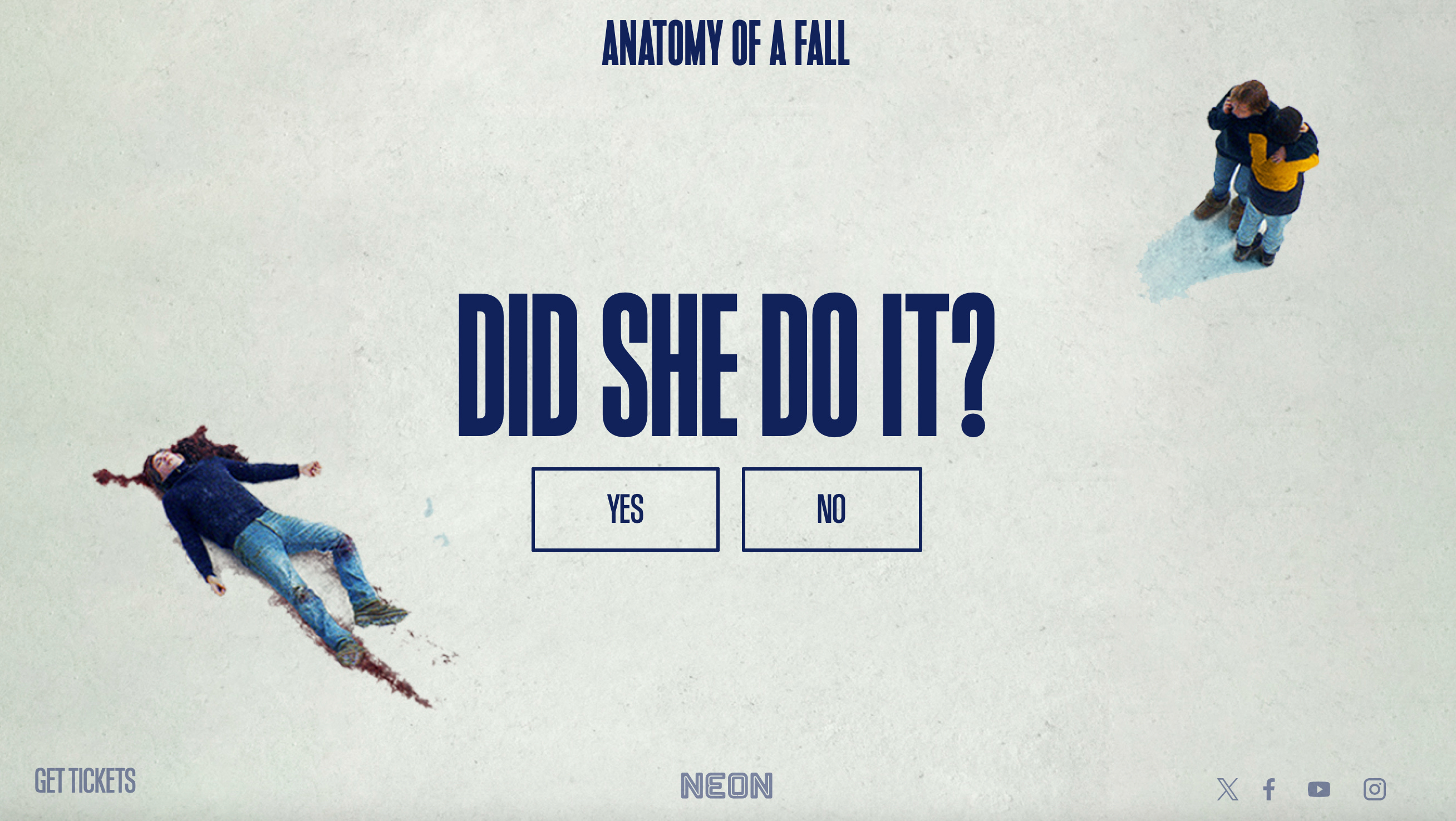 The Neon-distributed release of Anatomy of a Fall playing now in American theaters opens with a card advertising “didshedoit.com.” Going to the link after finishing the film, the page displays a giant binary choice, two buttons for the user to press: YES or NO. Choosing one response then shows the up-to-date results of the poll (currently 34% Yes and 66% No), and gives users space to submit their written reasoning.