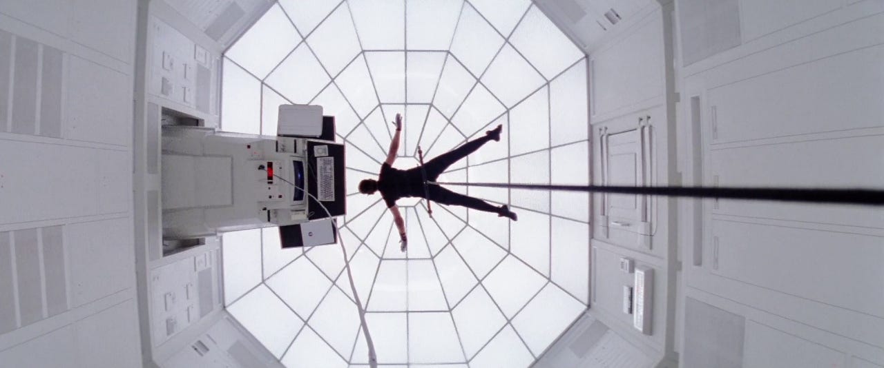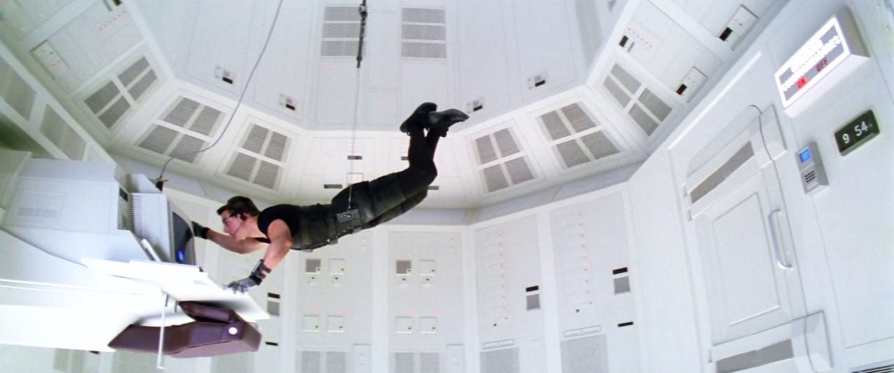 The scene that follows lives by these words. Every sound effect is so carefully considered and doled out, because there are so precious few of them. The scene is so quiet and precise that it asks the viewer to be quiet with it, to the degree that one becomes extremely aware of the sounds of their viewing space, even of their own breathing. Every shot choice is so careful in what specific information it provides to the viewer, what exactly it wants us to be aware of at any given time to create maximum suspense (the tension of the rope, the temperature of the room, the movements of the office worker who stands to discover Ethan, etc.). The editing is so measured and precise in how it ratchets that tension up and down, very gradually, the length of shots slowing and quickening gently as the different planes of action interweave. The Mission: Impossible franchise has gone on to do many all-time great action set pieces, but they've never quite done a scene of pure sustained tension like this again. It’s the kind of scene anyone with any desire to make movies should do a deep, shot-by-shot dissection of, to understand how a film can expertly guide the viewer to the edge of their seat while making them feel like an active participant.